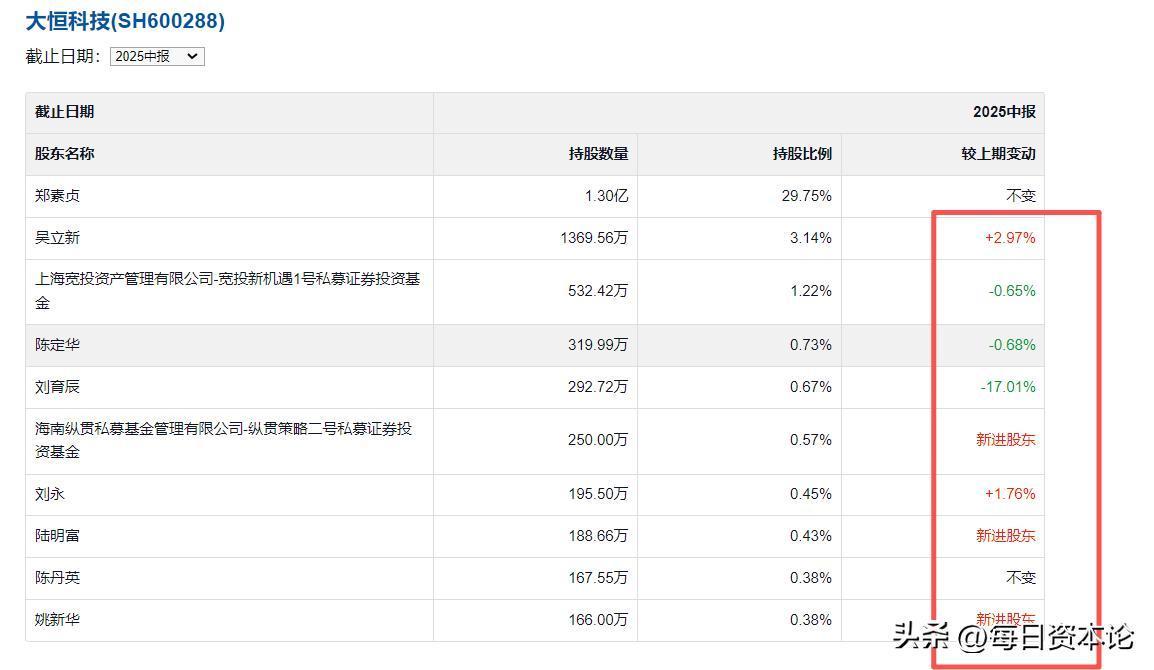 或让资本市场存在想象力的是,随着郑素贞的彻底退出,大恒科技的股东结构正在经历一场大换血。2025年中报显示,大恒科技十大流通股东发生了显著变化:3位股东新进,3位股东退出,2位股东增持,3位股东的持股减少。