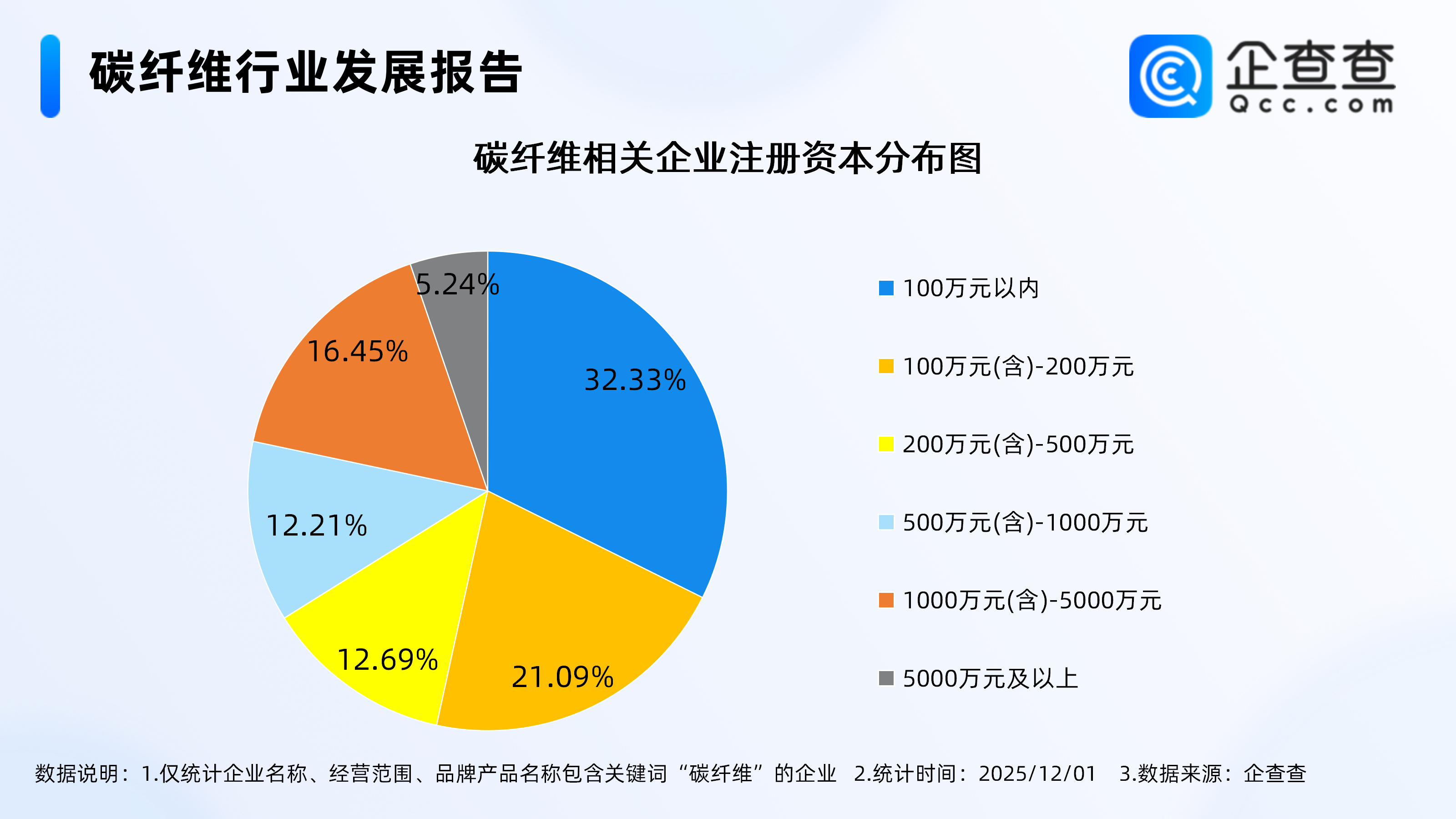 据央视新闻报道,11月30日,山西一高性能碳纤维项目在大同市云冈区竣工投产,成功实现12K小丝束T1000级碳纤维国产化量产,这标志着国产高性能碳纤维规模化量产实现关键性突破。据介绍,项目所生产的T1000级碳纤维单丝直径仅6至7微米,不足头发丝的1/10,拉伸强度却突破6400兆帕。碳纤维广泛应用于国防军工、航空航天、轨道交通、低空经济等领域,被称为“地表超强材料”。而高性能碳纤维是世界各国发展高新技术、国防尖端技术和改造传统产业的“血脉”和先导,是我国战略性新兴产业中主要的发展方向之一,被誉为“新材料之王”。此项目的投产打破了我国高端碳纤维的进口依赖,对保障国家战略物资安全具有重要意义。企查查数据显示,截至12月1日,国内现存碳纤维相关企业4.7万家。从经营时间来看,成立年限在1-3年的碳纤维相关企业最多,占比31.34%。从注册资本来看,碳纤维相关企业多为轻量级企业,注册资本在100万元以内的相关企业最多,占比32.33%。从地区分布来看,分布在华东地区的碳纤维相关企业最多,占比39.36%。注册量方面,2024年全年注册9068家。截至目前,今年已注册7623家。1.成立年限在1-3年的相关企业最多