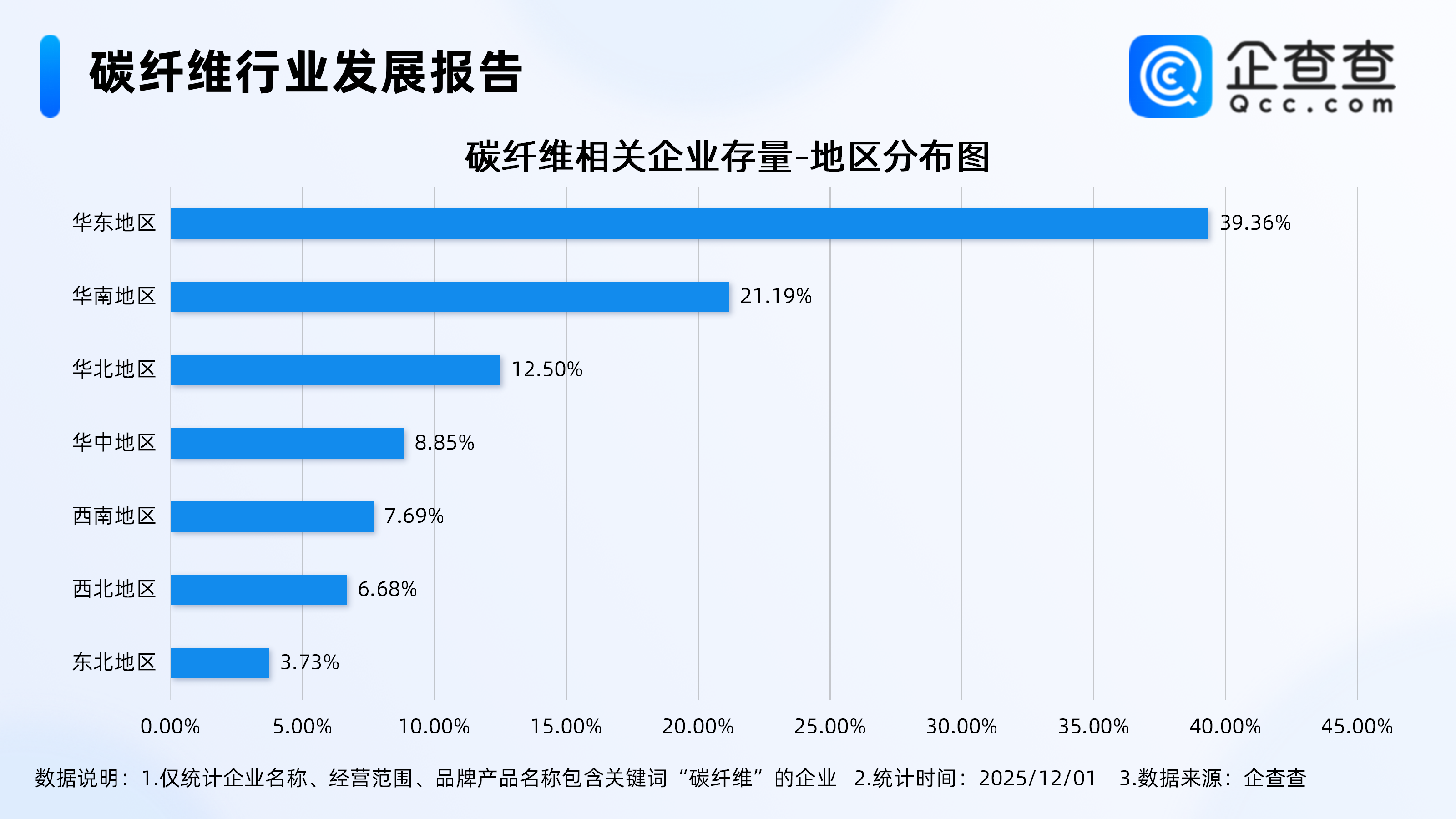 企查查数据显示,从注册资本来看,碳纤维相关企业多为轻量级企业,注册资本在200万元以内的相关企业过半,其中注册资本在100万元以内的相关企业最多,占比32.33%;100万元(含)-200万元的相关企业占比21.09%。3.分布在华东地区的相关企业最多