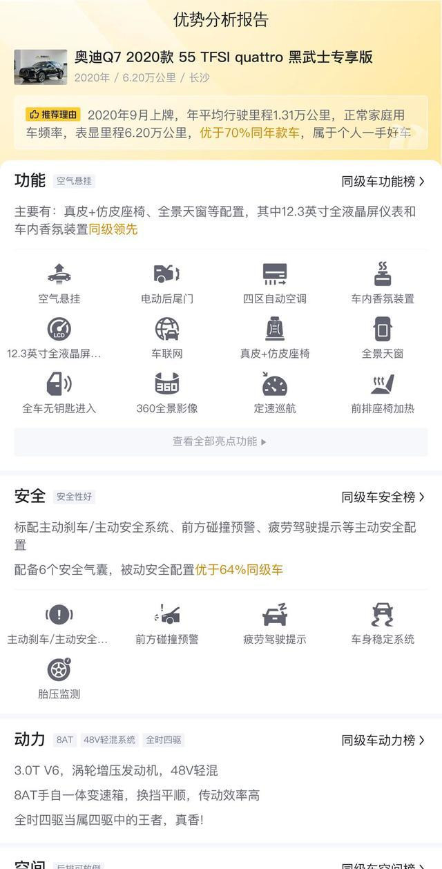 虽说Q7在各个方面表现都不俗,但如何定义一款车的性价比仍旧是一道难解的课题。根据懂车帝的数据显示,二手市场上的2020款Q7 55 TFSI quattro 黑武士专享版价格大约在35.98万元,考虑到其卓越的性能和豪华内饰,这个价格并不算太贵。在今天,越来越多的消费者在购车时,开始考虑二手车的性价比。在竞争激烈的全新豪华车市场里,二手车能够提供更高的性能与舒适性,而Q7恰恰是一个值得关注的选择。